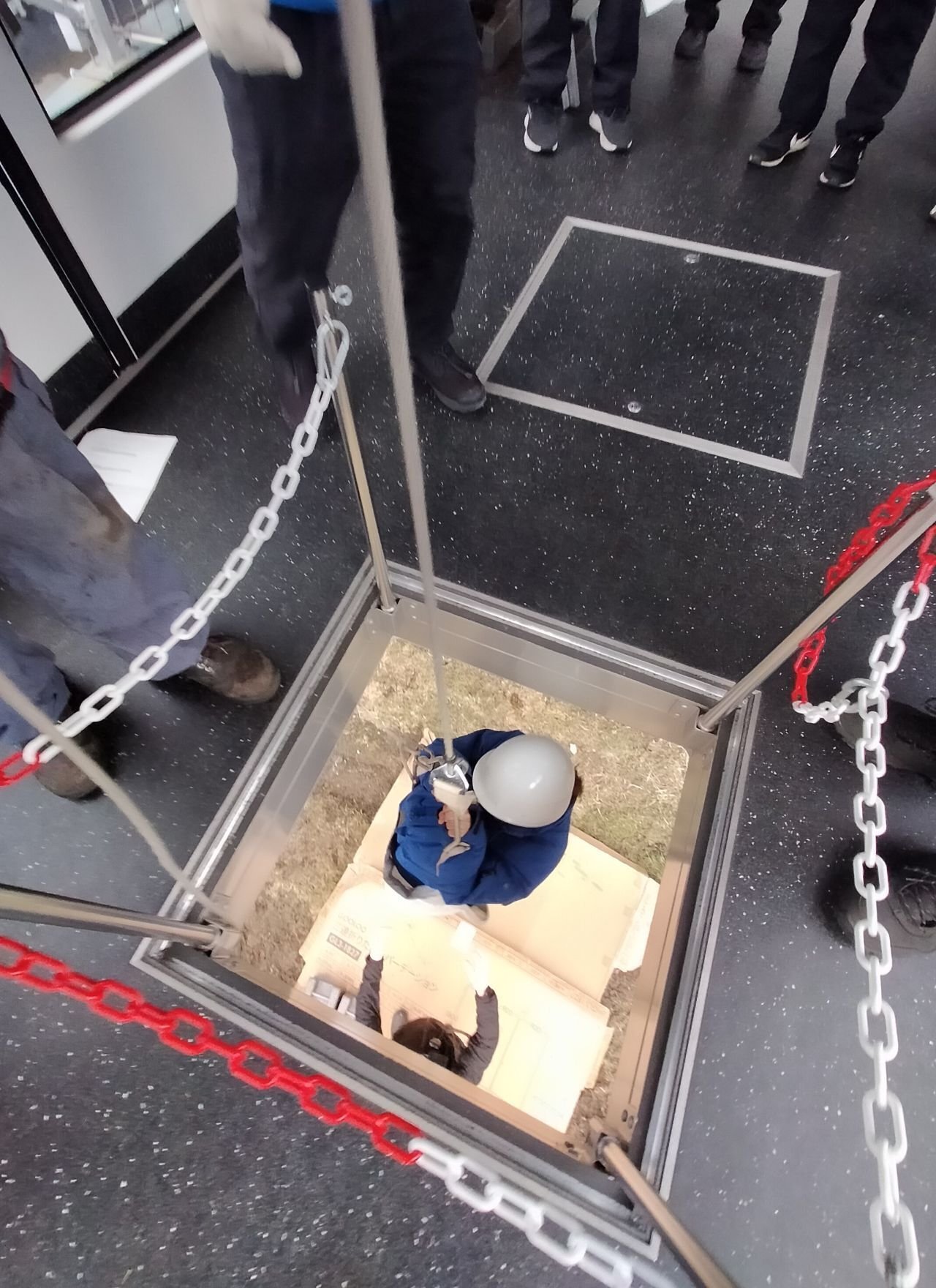 実際の救助器具を使い、手順を確認しながら緊急脱出口から従業員自ら救助者役として地面へと降下していきます。