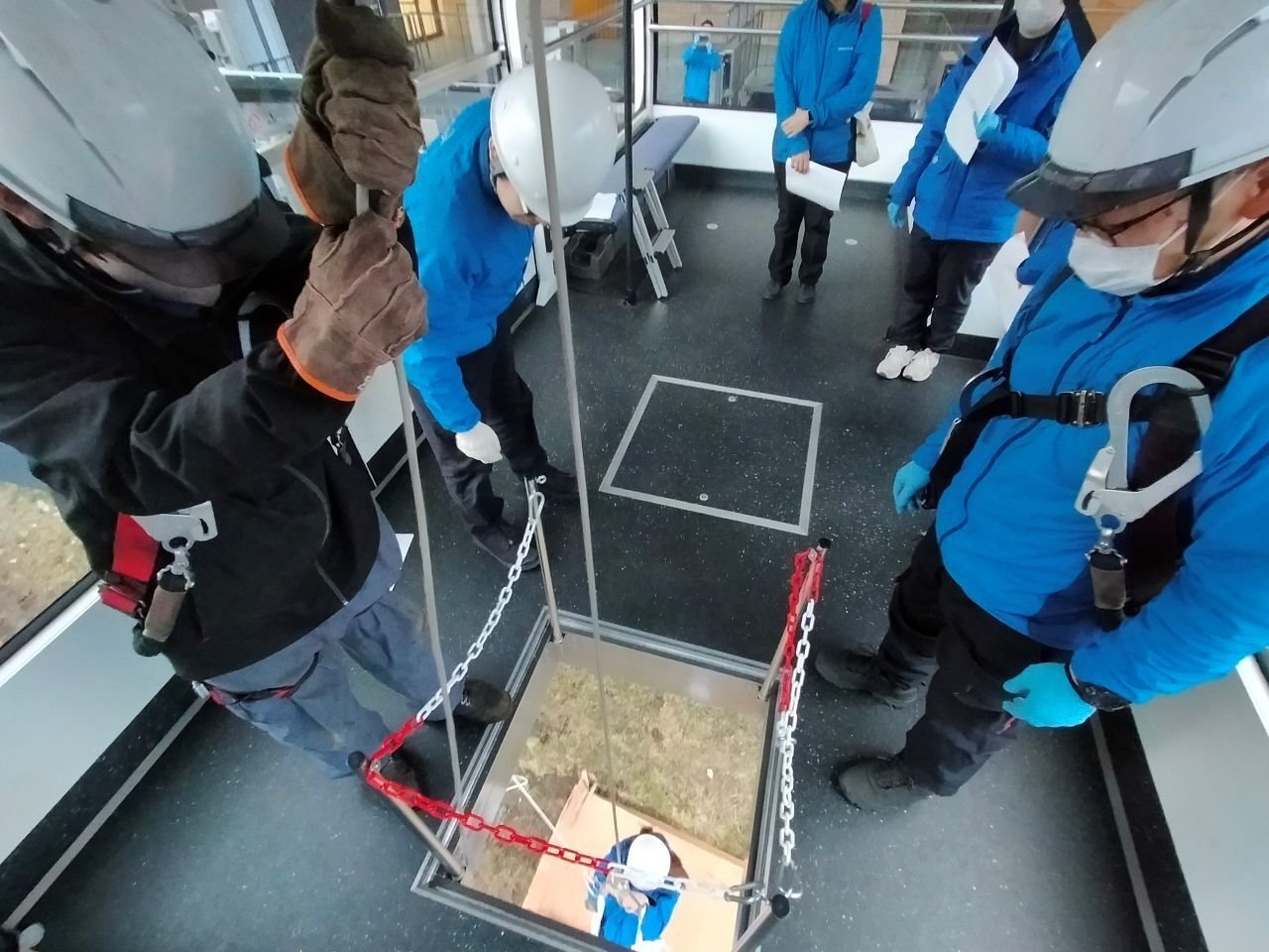 待機している地上班が救助者役を受け止め救助手順が完了。